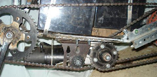 Basically, the swivel point would be at the former rear dropouts of the Magna frame I'm using for the front half of the bike. They're dropouts, so they are strong enough to take the strain, even though I no longer have the seat stays that went down to them that you can see in this pic of an older revision of the bike (the batteries now rigidly fill part of the space between the top tube and the base of the bottom triangle/diamond formed by the chainstays).